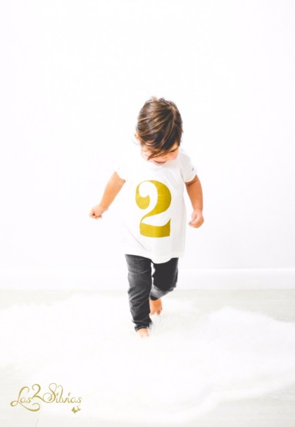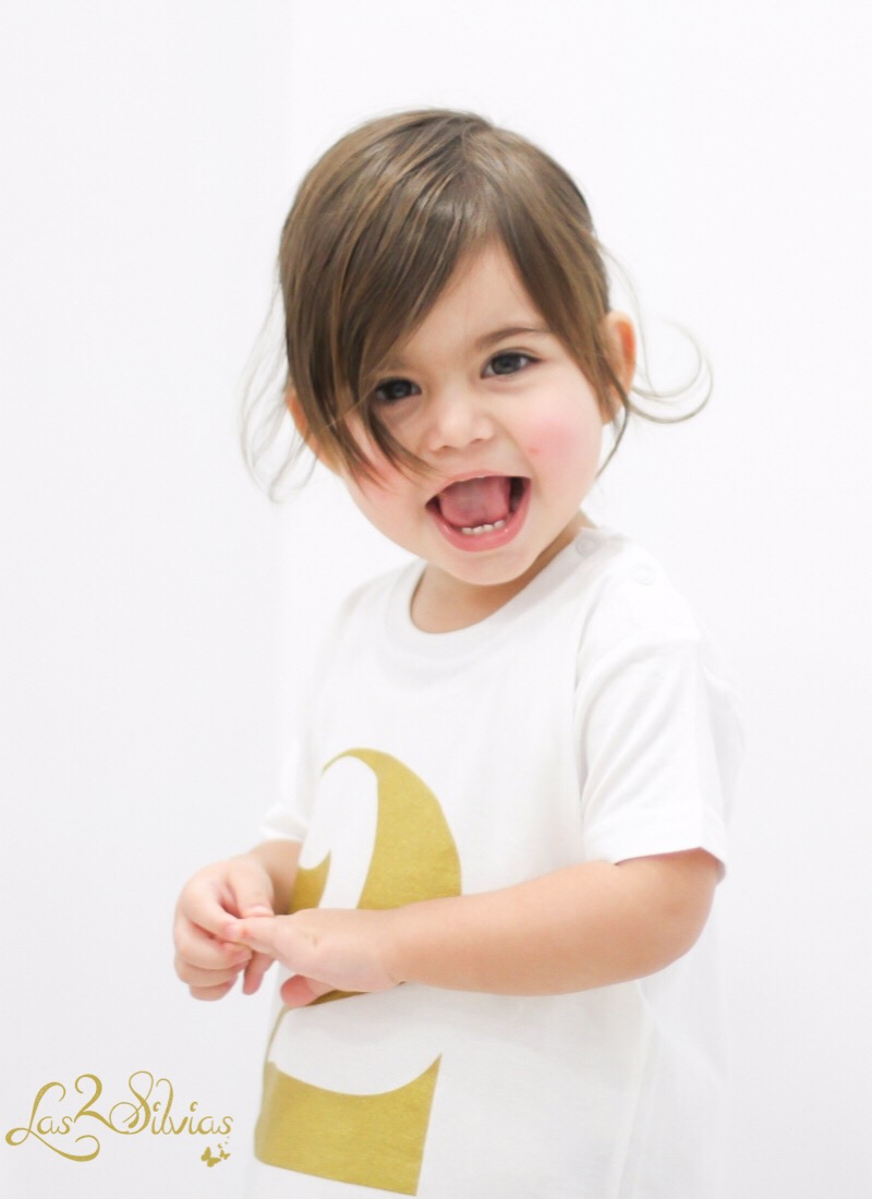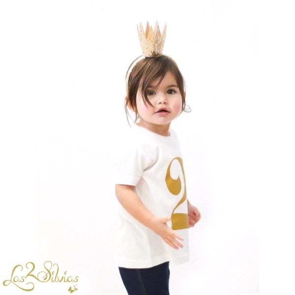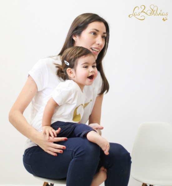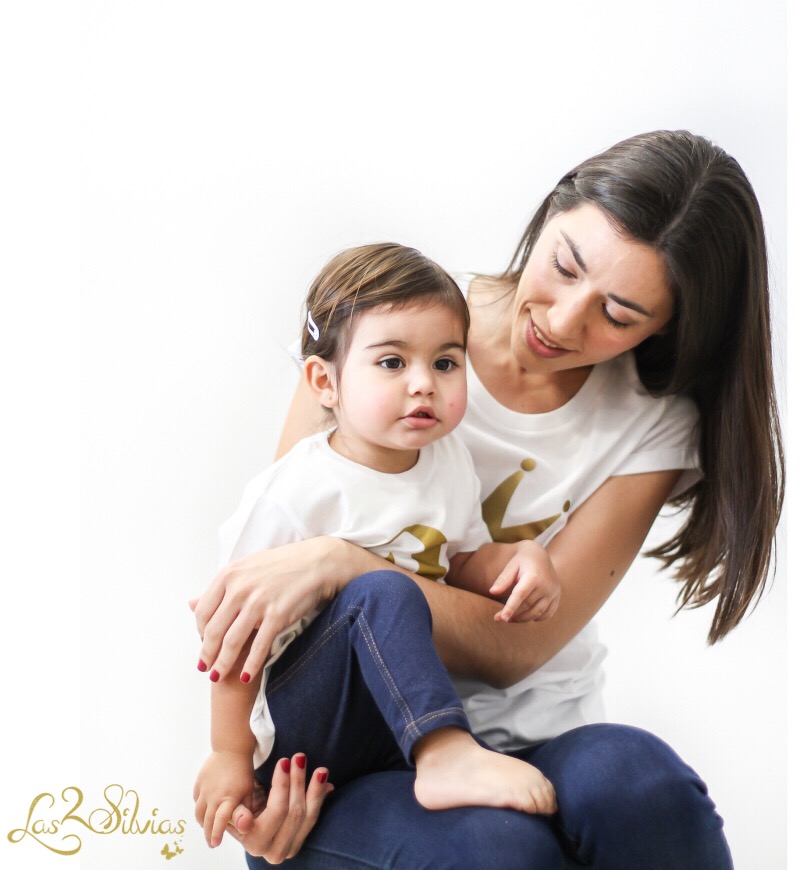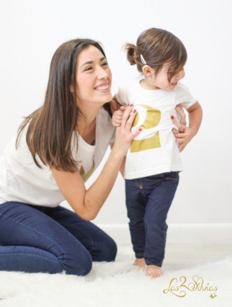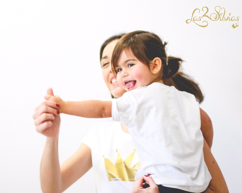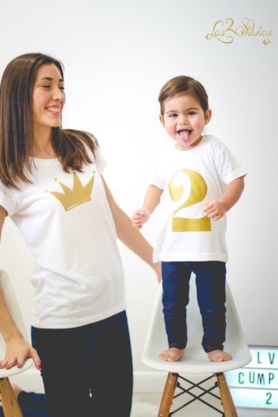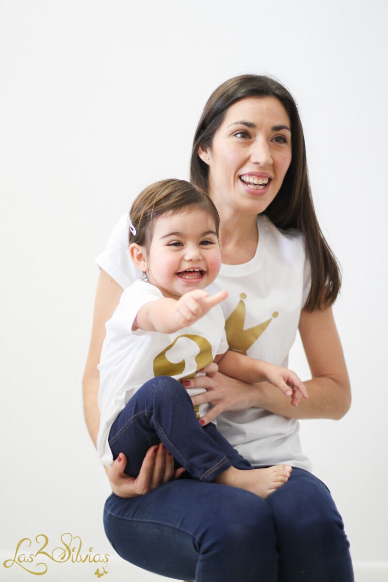 Vi una camiseta de MomasMini en el perfil de Ni rosa ni azul y me encantó para la sesión. Cuando vi en su tienda aquel 2 dorado me imaginé a Silvia con tutú a juego y corona. Yo quería salir con ella en las fotos y recordé las camisetas que hace Moukids. Elegí la que lleva impresa una corona dorada para mí.