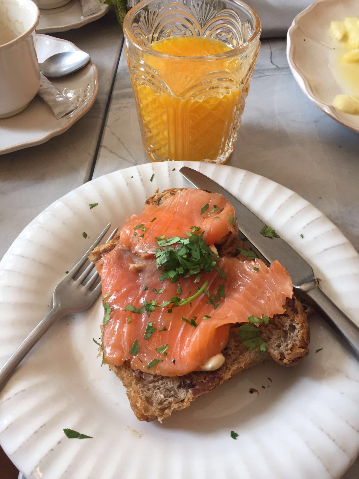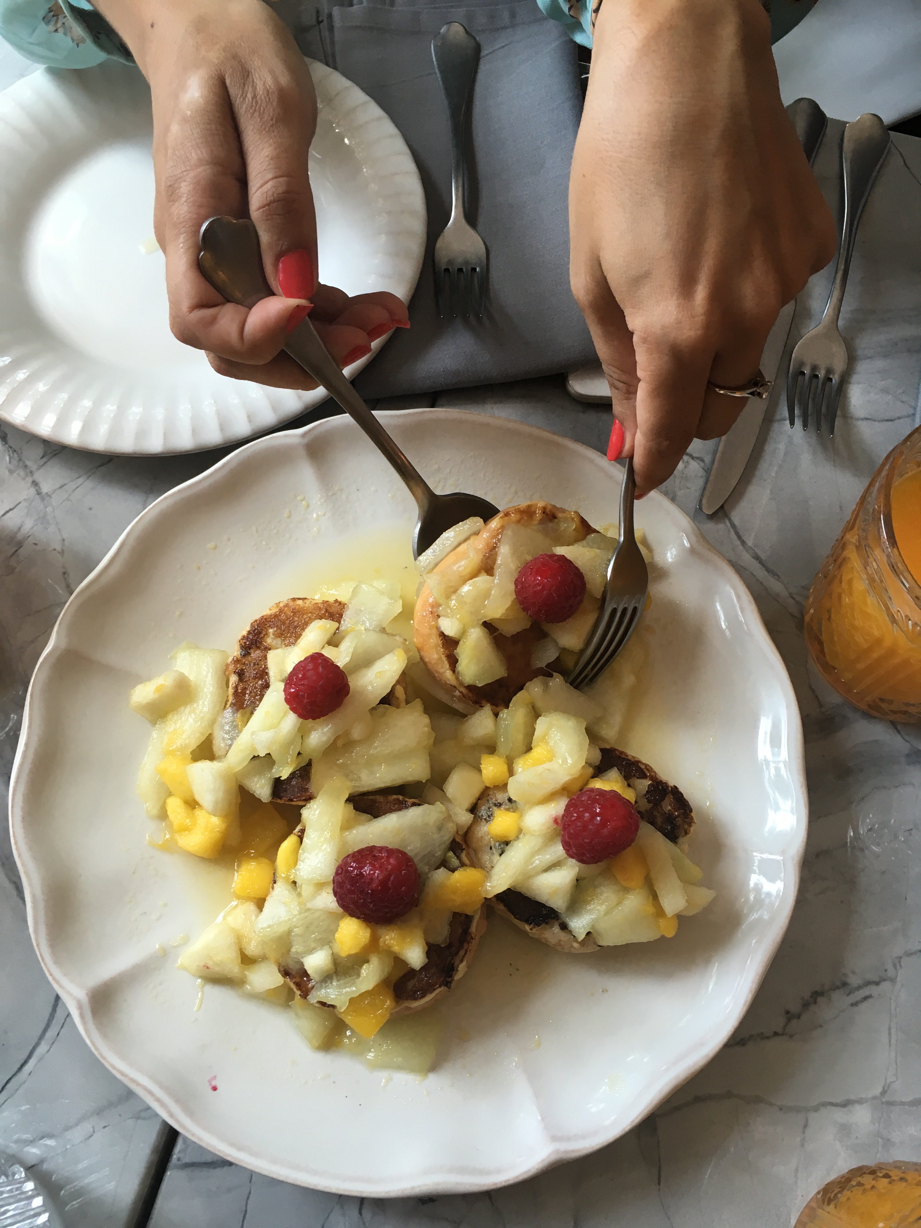 Allí nos estaban esperando ya Silvia de BenitoGogoche y Marta (Mamitamartyta). Enseguida llegaron OlgaJenny (My Petit Pleasures)Lidia Bedman y Laura Milla. Disfrutamos de un brunch buenísimo: tostadas francesas con fruta, brioche con salmón marinado, café, zumo y agua infusionada de pepino.