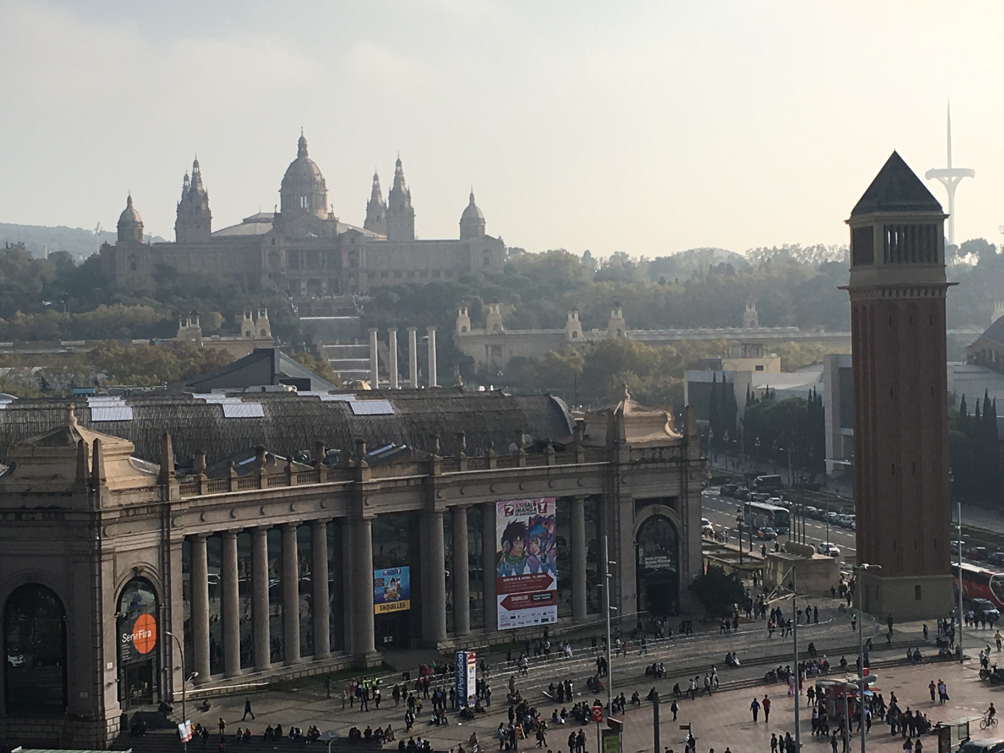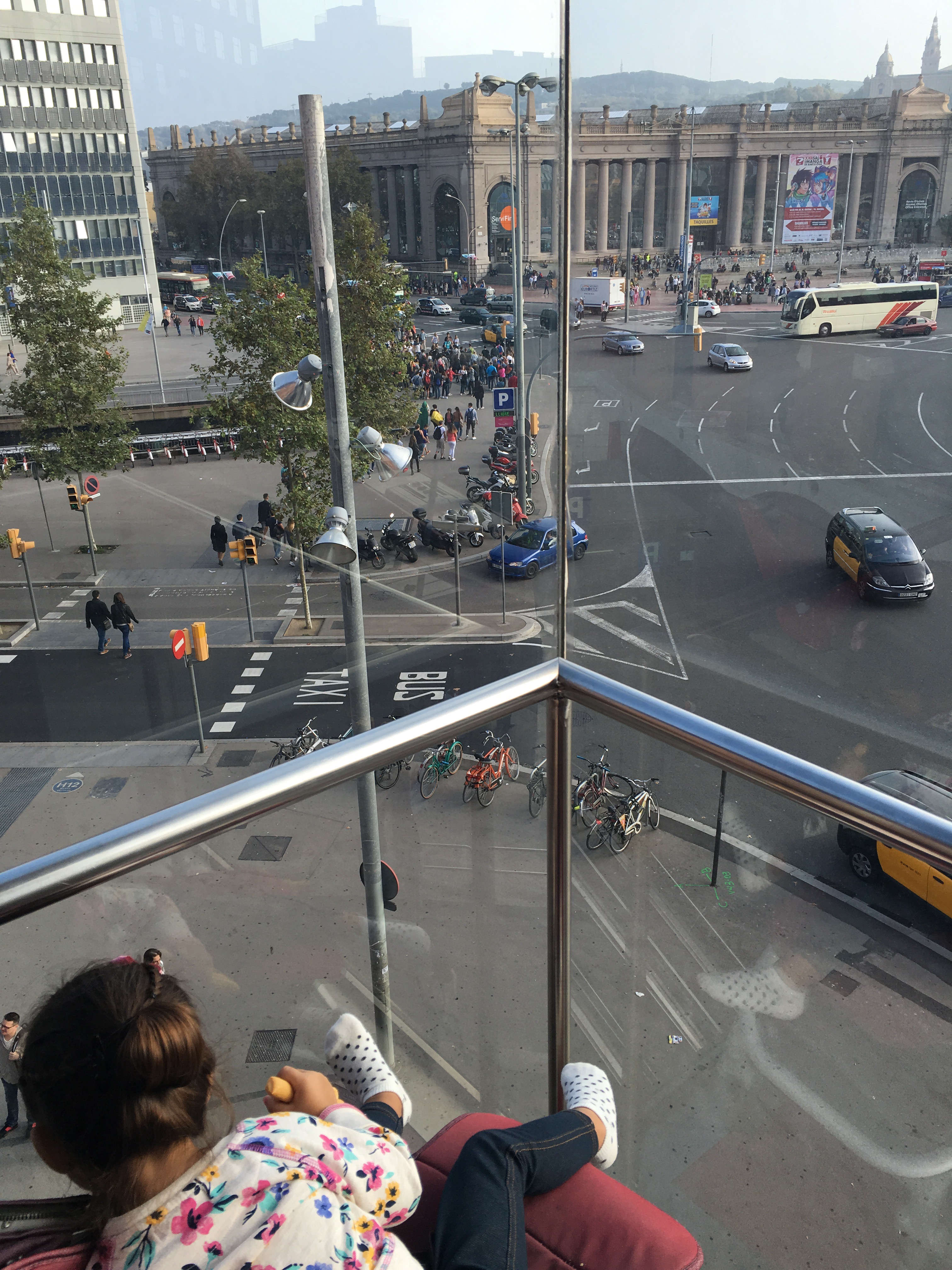 Por la noche, fuimos a cenar al Centro Comercial Arenas situado en una antigua plaza de toros. En la parte superior, que está al descubierto, están los restaurantes y tiene un ascensor para subir y disfrutar de las vistas de Montjuic. El ascensor cuesta 1€, pero es gratis para carritos de bebés y personas de movilidad reducida. (También se puede subir por el interior del Centro Comercial para acceder a la zona de restauración.)