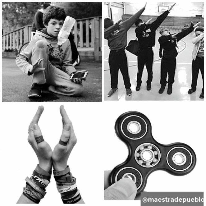 No sé cuánto tiempo durará esta moda. Pensaba que la tontería de darle la vueltecita a la botella o hacer el gesto ese que aún no entiendo con los brazos hacia arriba, pasarían pronto, pero no tiene pinta 🙈 Cada curso la misma historia. En esta foto de Maestra de Pueblo (de la que soy muy fan) se resumen las modas de este curso 17-18 en nuestros los colegios.