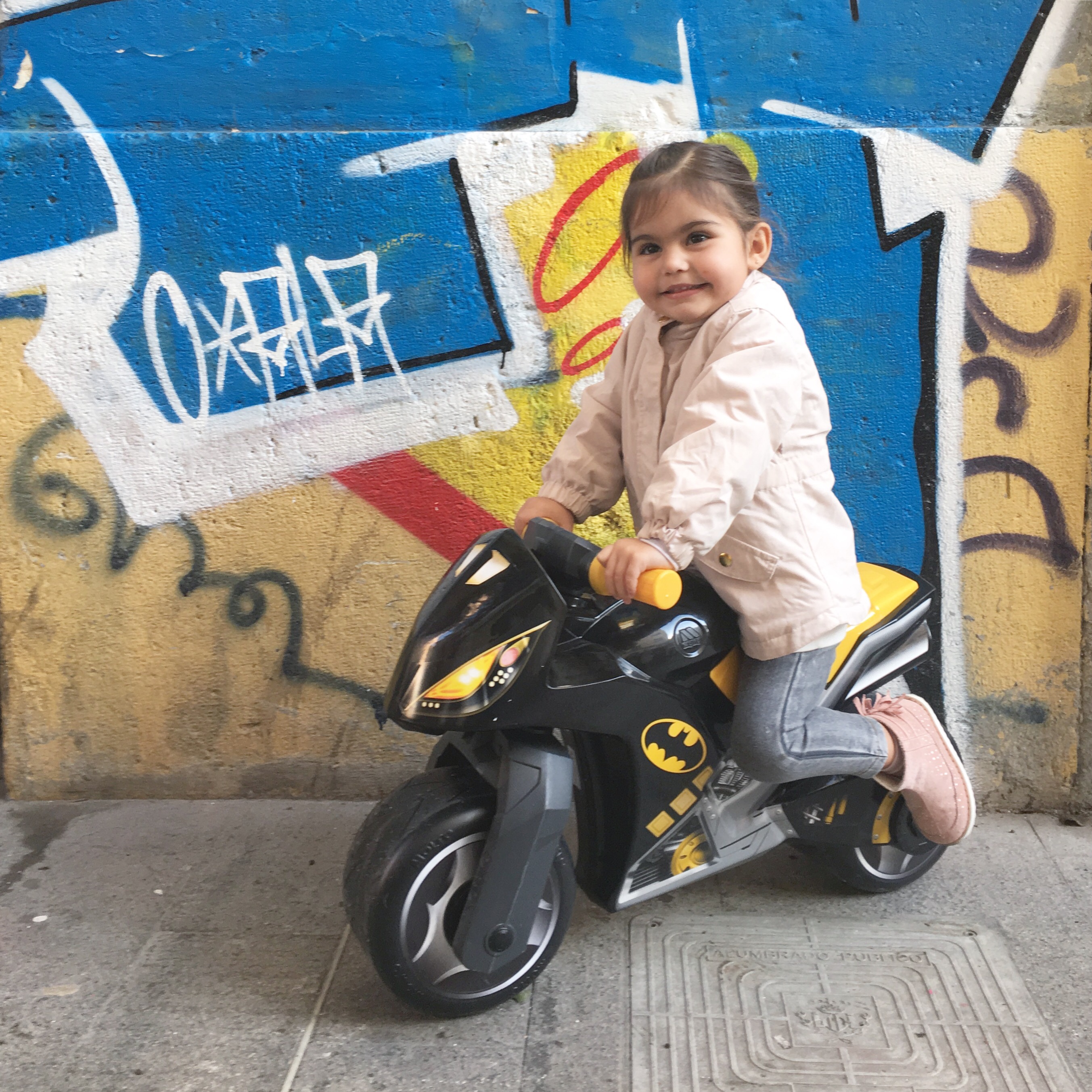 Desde esta Navidades, Silvia es muy fan de Batman. Los Reyes Magos le regalaron una moto suya y no hay quien la baje. ¡Es que tiene ordenador, mamá! (Es una pegatina, pero ella alucina 😂)