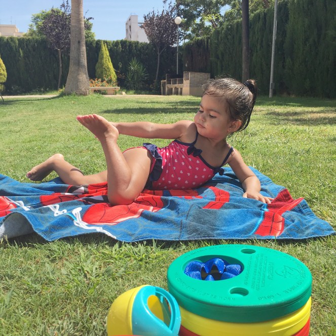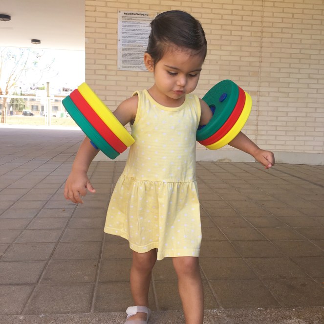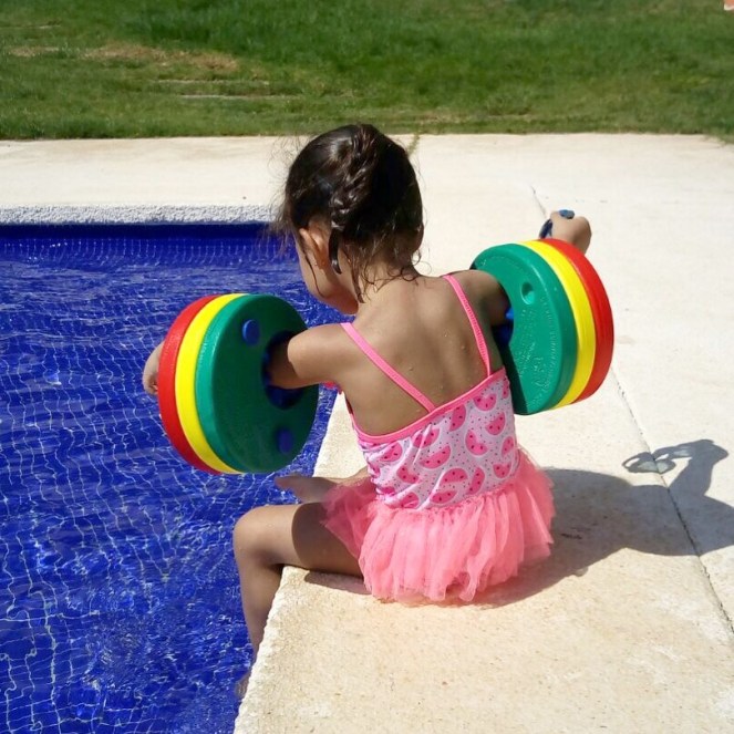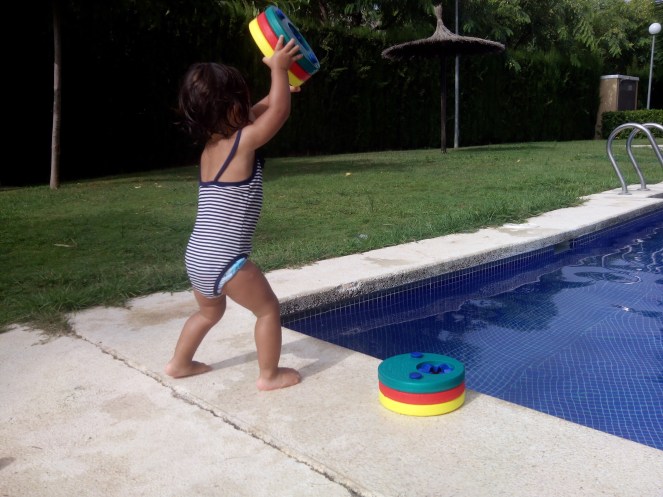 El verano pasado dimos un paso más y se los ponía pero no había manera de que se quedara sola en el agua. El miedo le podía. No quisimos presionarla y no le obligábamos a ponérselos. Con bañarse en la zona pequeña y estar con nosotros al bracito en la grande le sobraba.