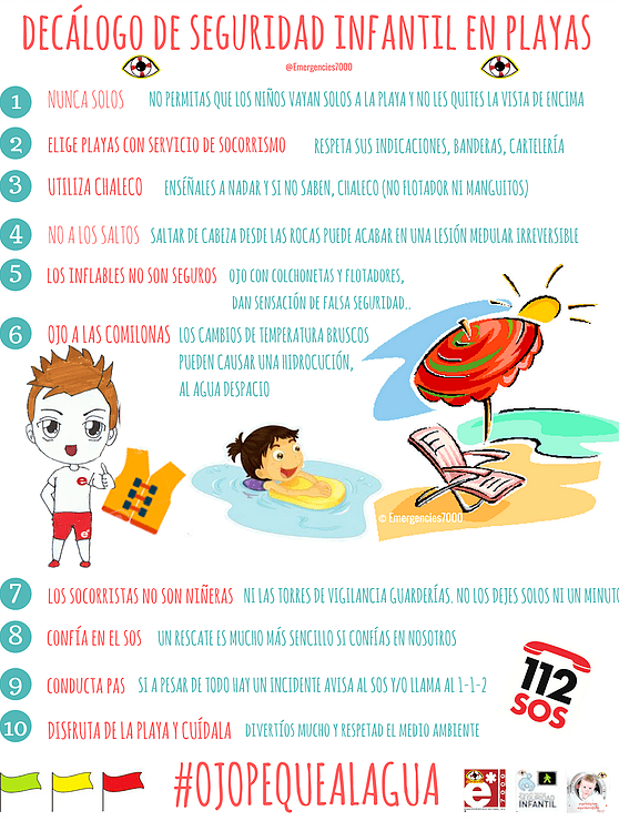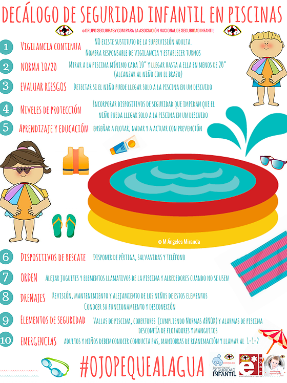 Esta norma forma parte de una serie de consejos que está difundiendo la Asociación Nacional de Seguridad Infantil, a través de su campaña #ojopequealagua y de la que os traigo sus Decálogos para la playa y la piscina a continuación. Pasad por su web porque encontraréis un montón de información interesante sobre este y otros temas.
